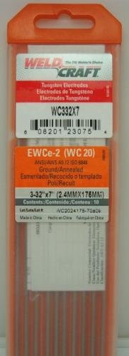 Weldcraft Tungsten Electrodes Package of 10 Tungsten Electrodes MFG # WC332X7 Type: 2% Ceriated Tungsten (EWCe-2) Performs well in DC welding and arc starting at low current settings, and can be used proficiently in AC processes. Size: 3/32" X 7" (2.4 mm X 175 mm) Applications: AC Alloying Element: None Compositio